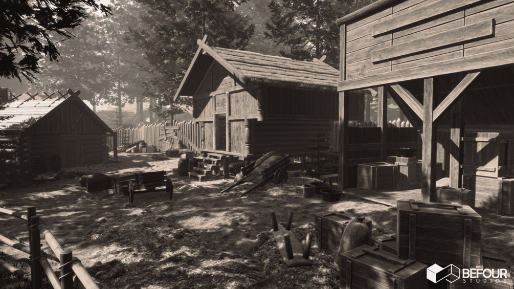Immerse in a Medieval Nordic Village Environment, featuring authentic Viking-era wooden modular houses with interiors and props, optimized for high performance across platforms.