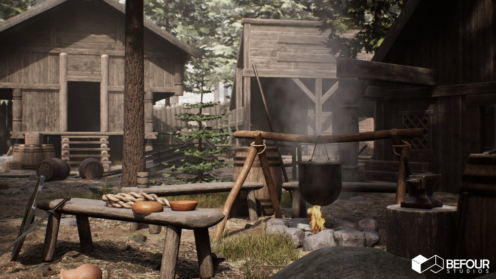 Immerse in a Medieval Nordic Village Environment, featuring authentic Viking-era wooden modular houses with interiors and props, optimized for high performance across platforms.