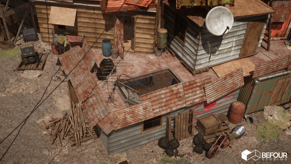 - Props: Bike, Trash Bags, Chairs, Generators, Boxes, Bottles, Beds, Cans, and lot more. Architecture: Wooden Walls, Panel Walls, Door, Roof, and etc.